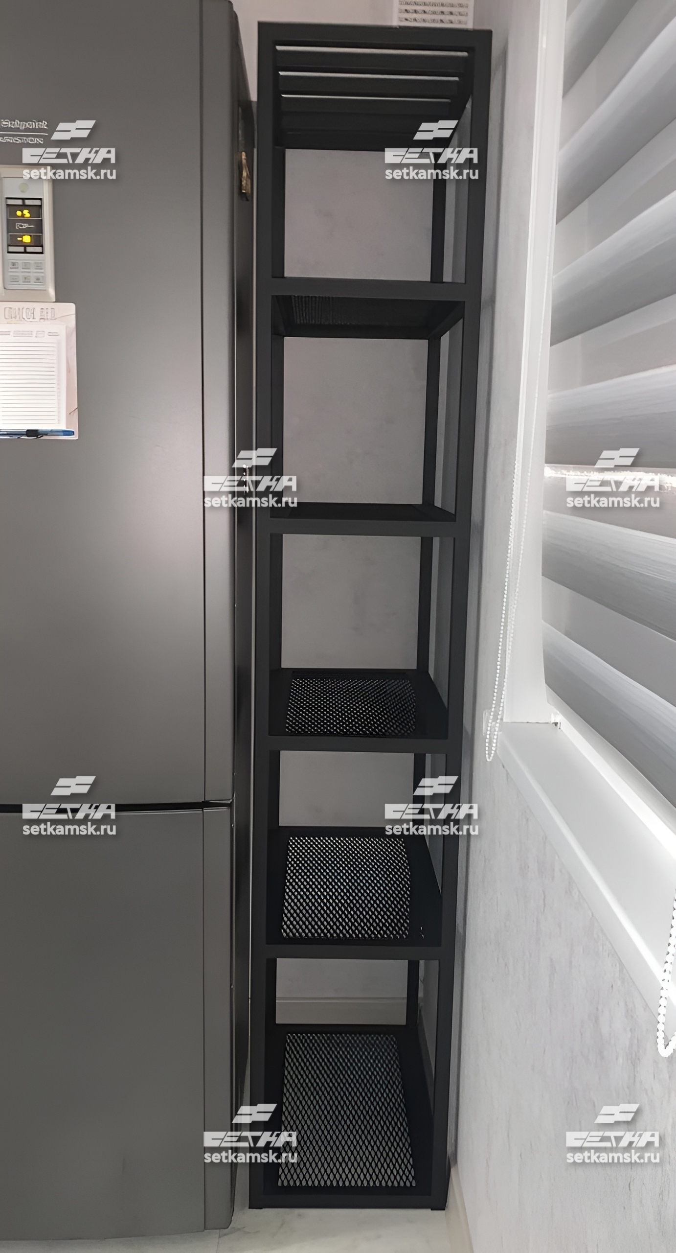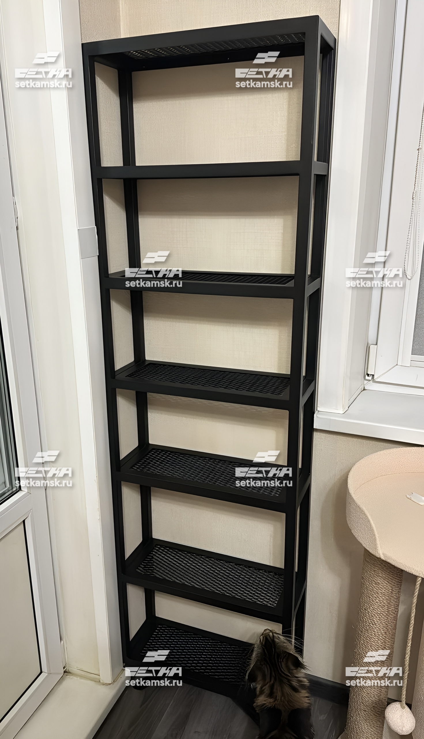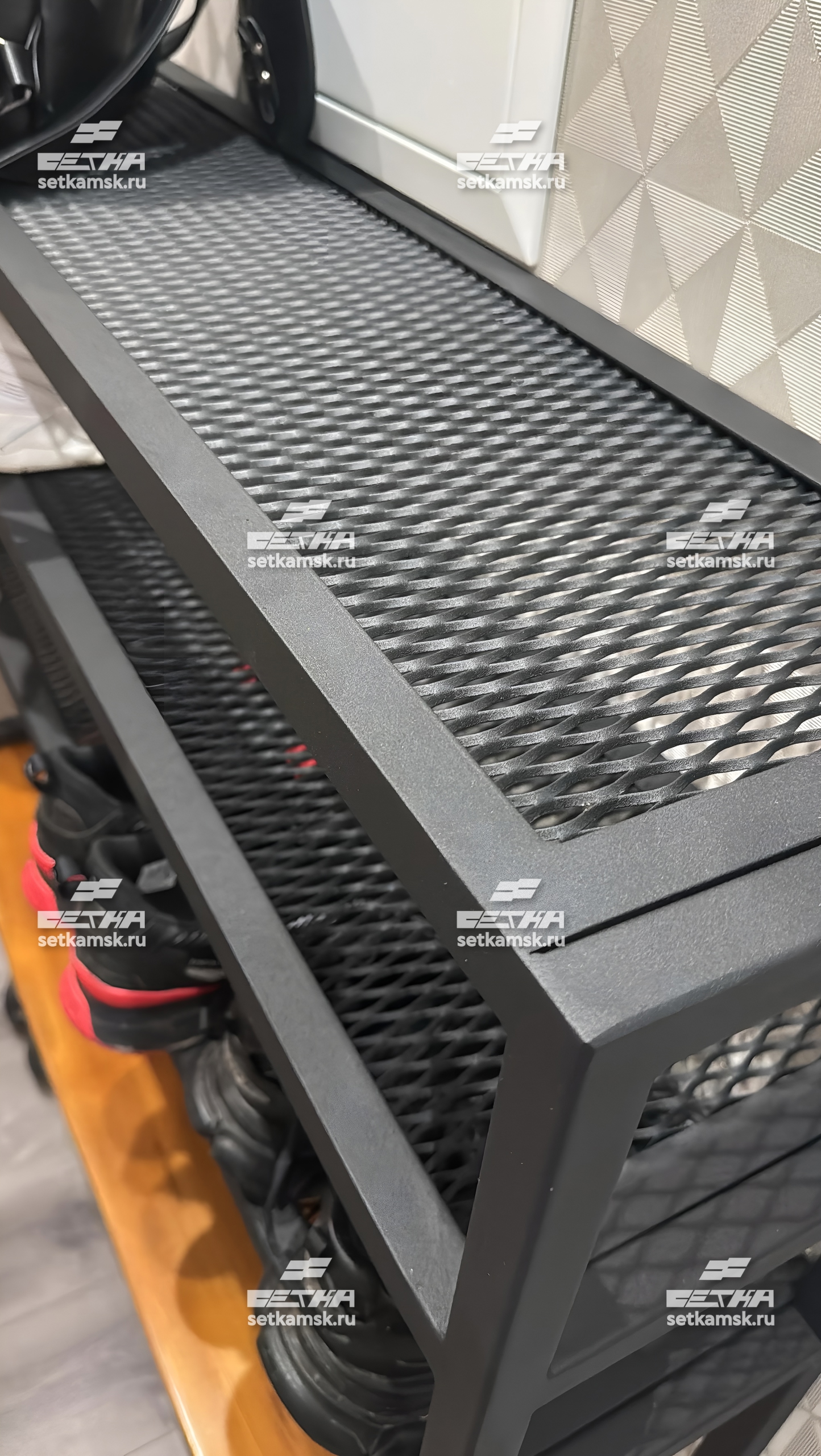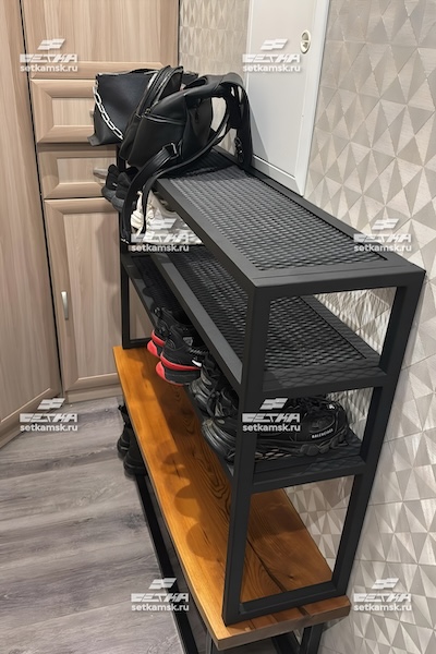 Обувница, окрашенная в черный цвет, состоит из трёх сетчатых полок. Стеллажи отличаются по габаритам, выполнены в лаконичном стиле, но при этом оба высокие и максимально практичные.