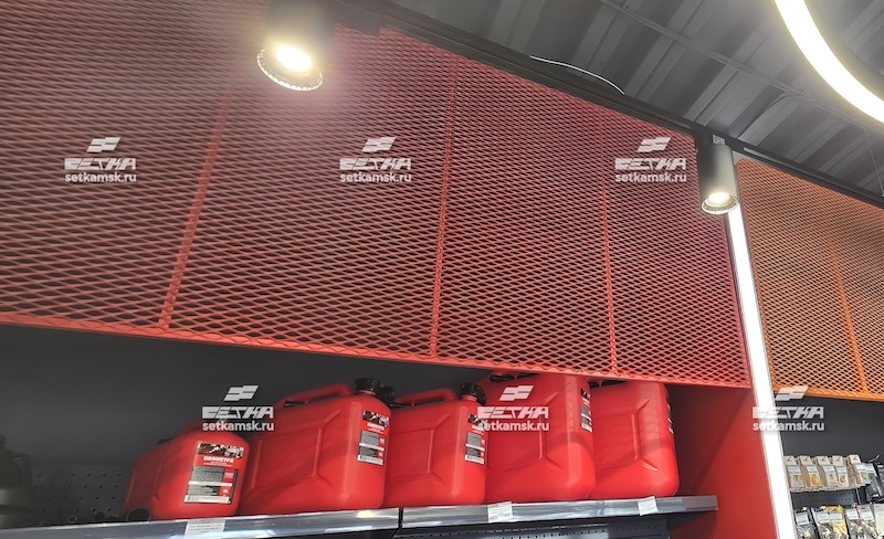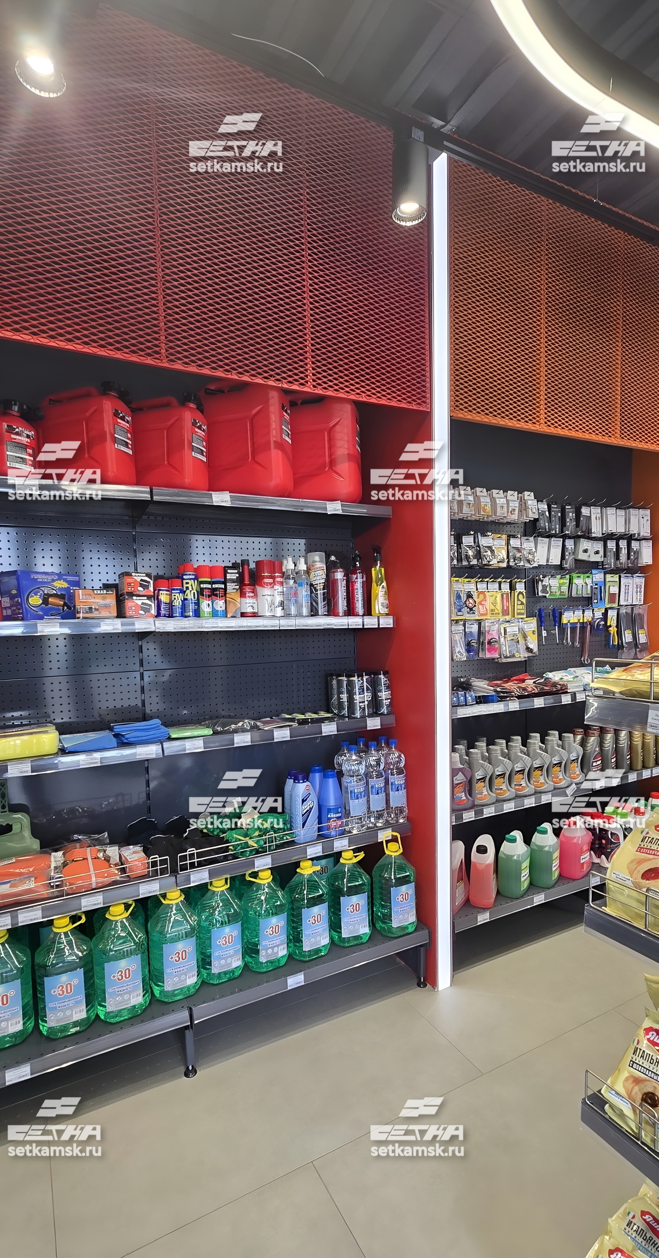 Наша сетка использовалась при оформлении сети автозаправочных станций «Tamic Energy». Пространство возле касс отделано стеновыми панелями, выполненными из ЦПВС/ПВЛ и окрашенными в различные оттенки.