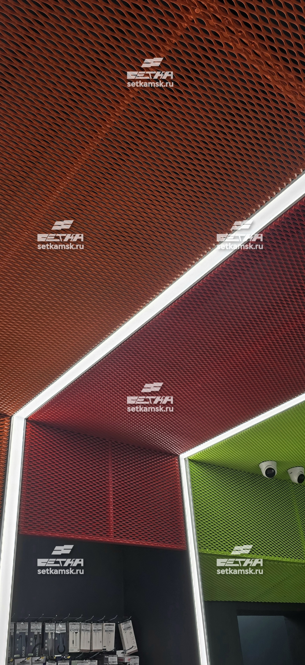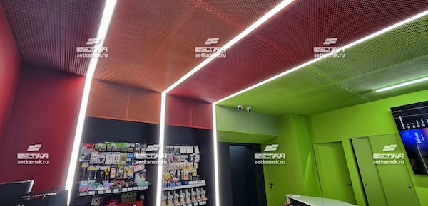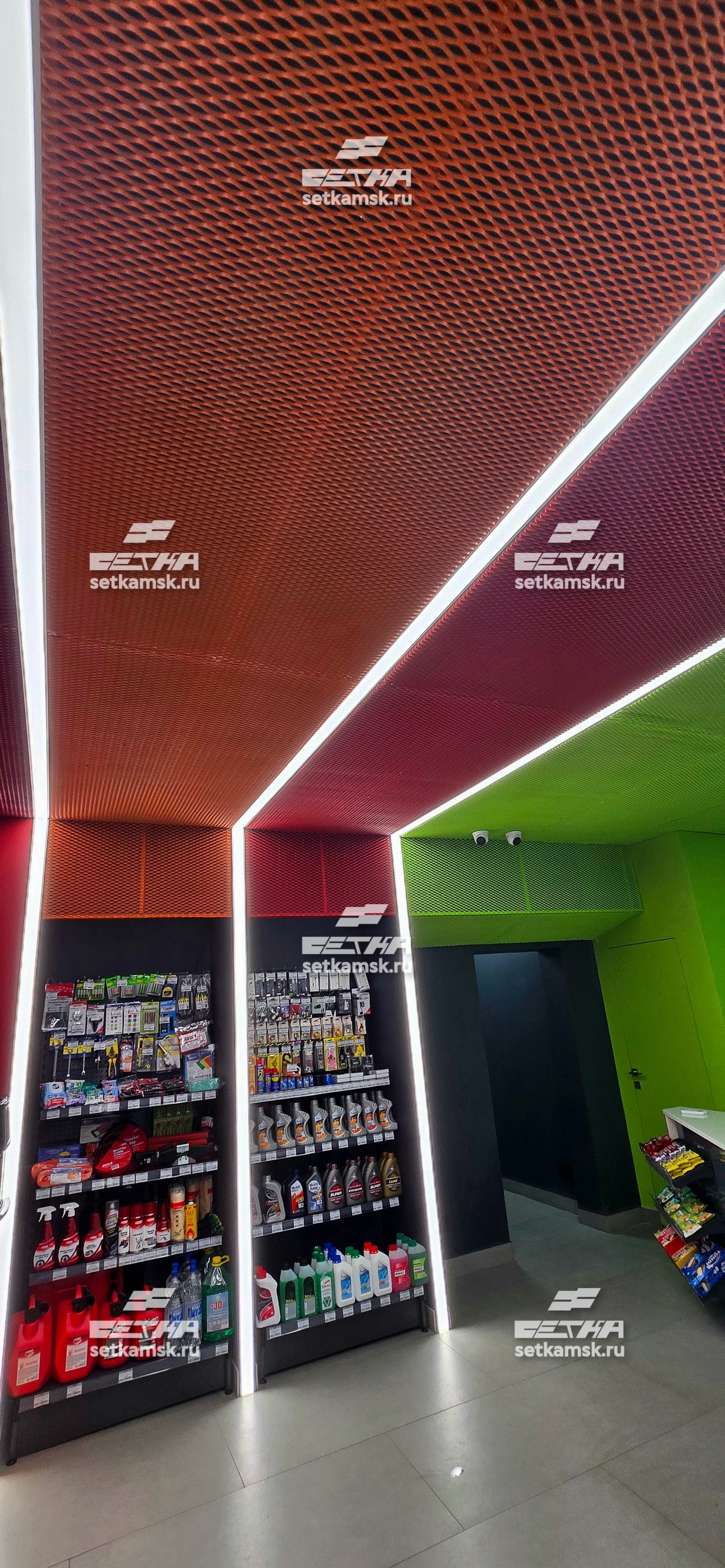 Произведенная нами сетка была использована при отделке сети АЗС «Tamic Energy». Применение ЦПВС/ПВЛ в качестве материала для потолочных и стеновых панелей позволило сформировать гармоничный и узнаваемый стиль, а также визуально расширить внутреннее пространство.