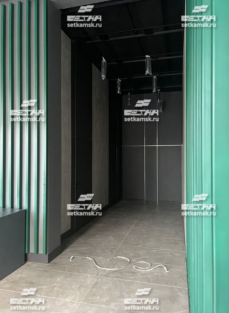Для потолочных панелей подходит сетка с разными ячейками. На данном проекте (Москва, 2-я Машиностроения, 27с6) использовалась ЦПВС/ПВЛ с размером ячейки 40х17 мм (толщина металла 1 мм, шаг подачи 6 мм). Вышли эффектные черные потолочные панели из сетки, отлично сочетающиеся с черными светильниками с ярким точечным холодным светом.