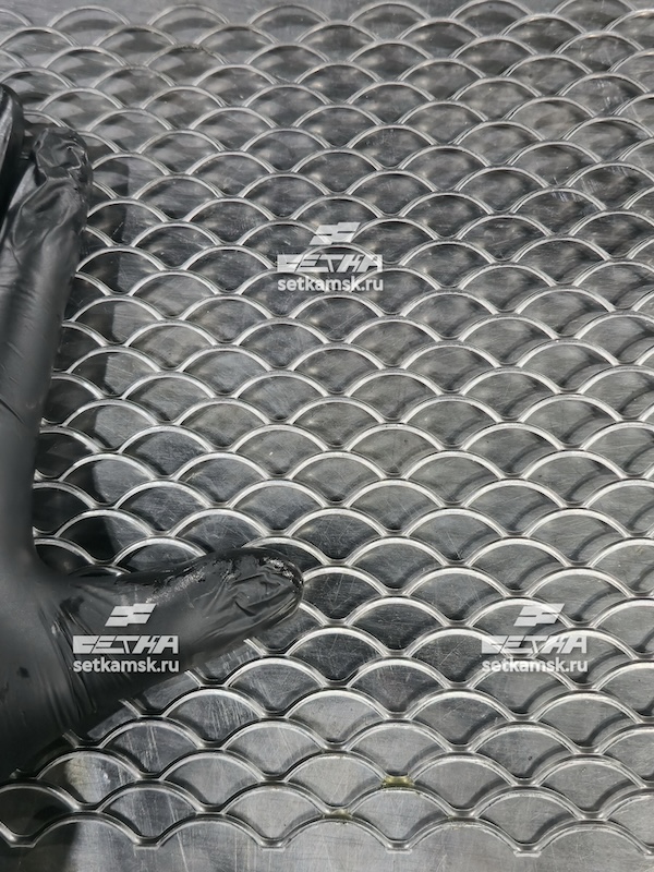 Цельнометаллическая просечно-вытяжная сетка с «чешуйчатой» ячейкой 28х12 мм. Позиция обладает высокой прочностью и жесткостью, а красивая «чешуйчатая» ячейка подходит для декоративных целей. Ячейка напоминает рыбью чешую или кольчугу. Этот рисунок эффективно играет со светом и тенью, что высоко ценится в дизайне. Напоминаем, что наша ЦПВС-сетка, благодаря цельнометаллической основе и особому расположению ячеек, не имеет сварных или иных соединений, которые могли бы стать «слабым звеном». Она устойчива к деформациям, вибрациям и значительным нагрузкам, не провисает со временем.