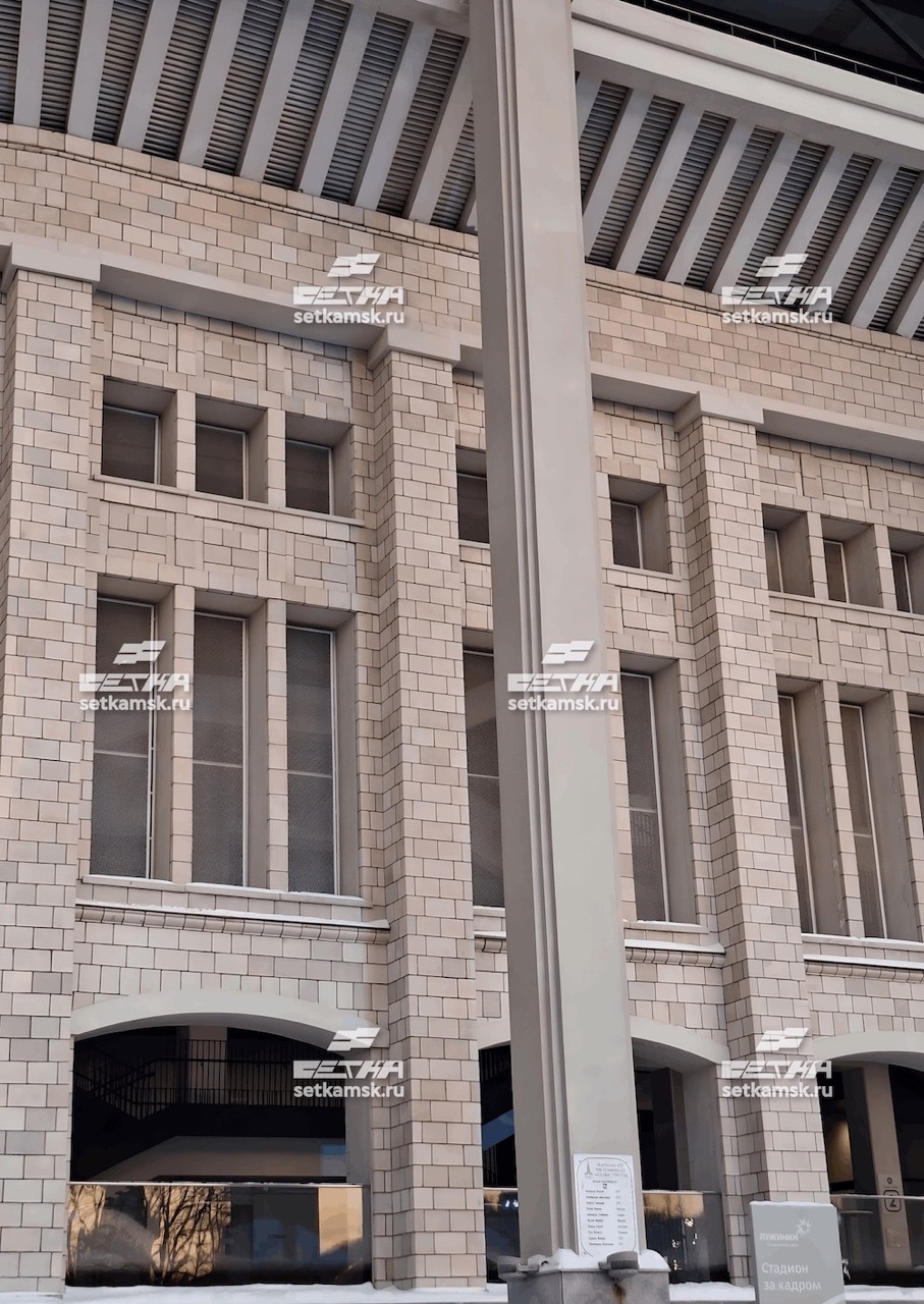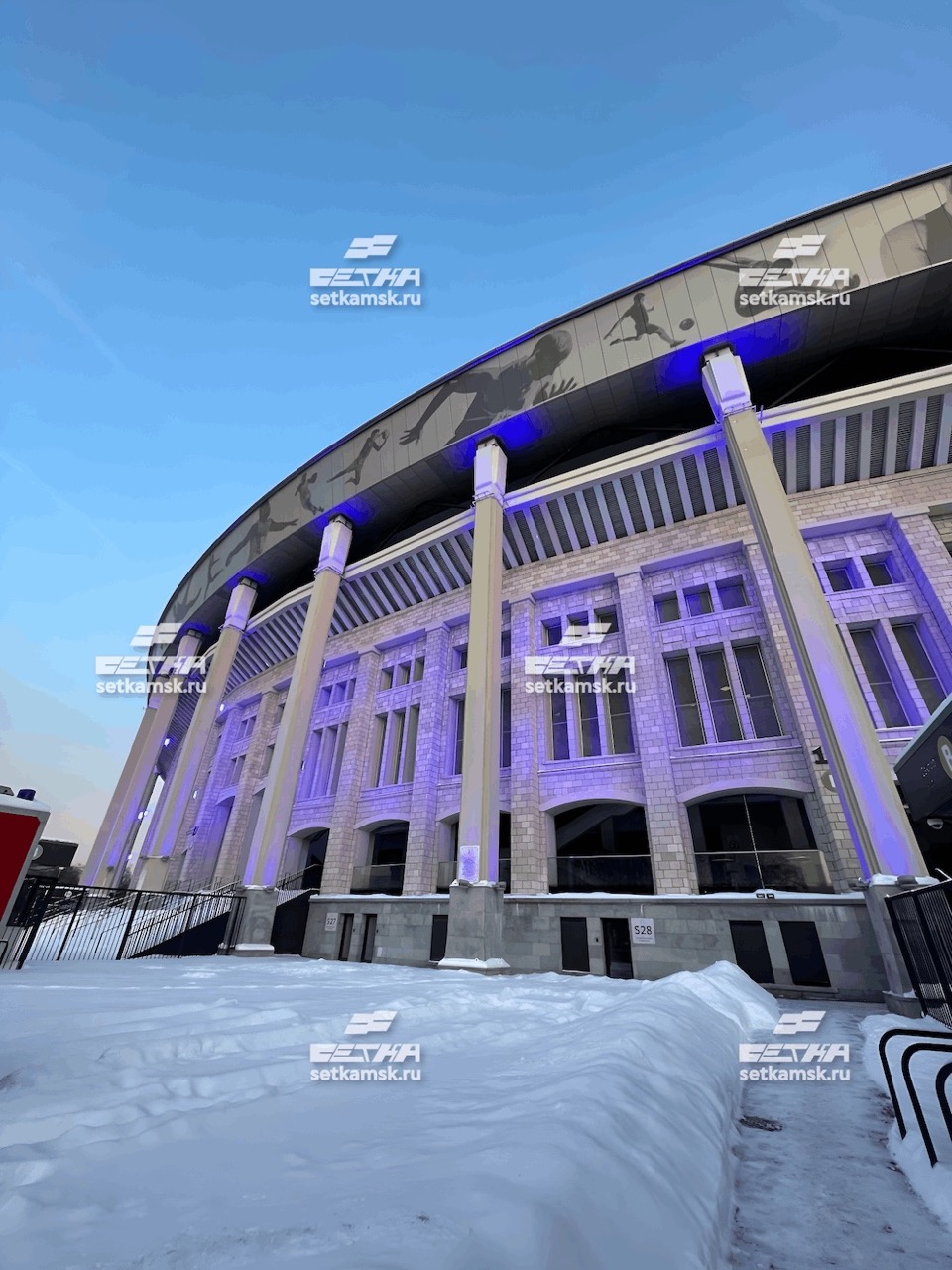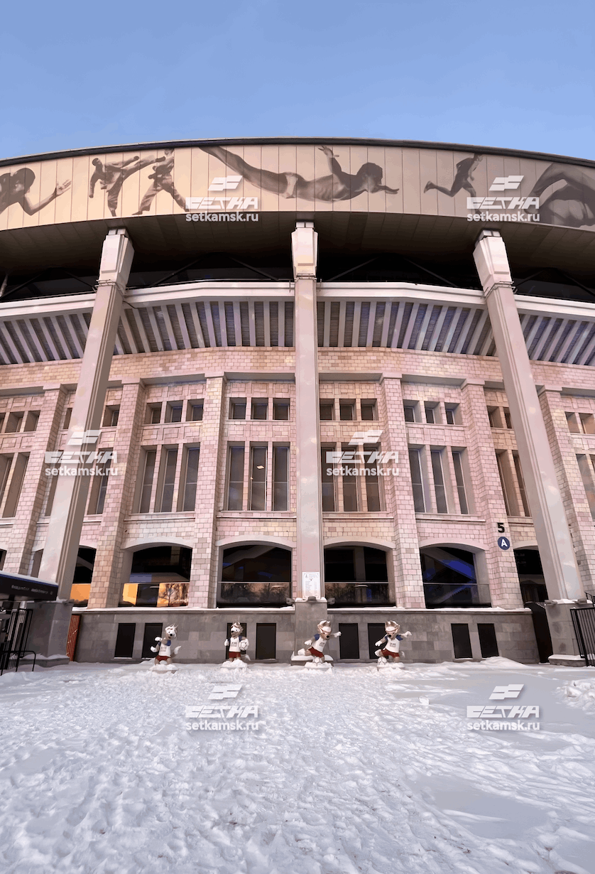 Мы очень рады, что наш материал стал, хоть и временно, но всё-таки частью фасада главной арены страны. Фасадные панели из алюминиевой цельнометаллической просечно-вытяжной сетки были установлены на фасад Большой спортивной арены «Лужники». Это отличный пример удачного временного архитектурного решения технической задачи с помощью конкретного промышленного материала.