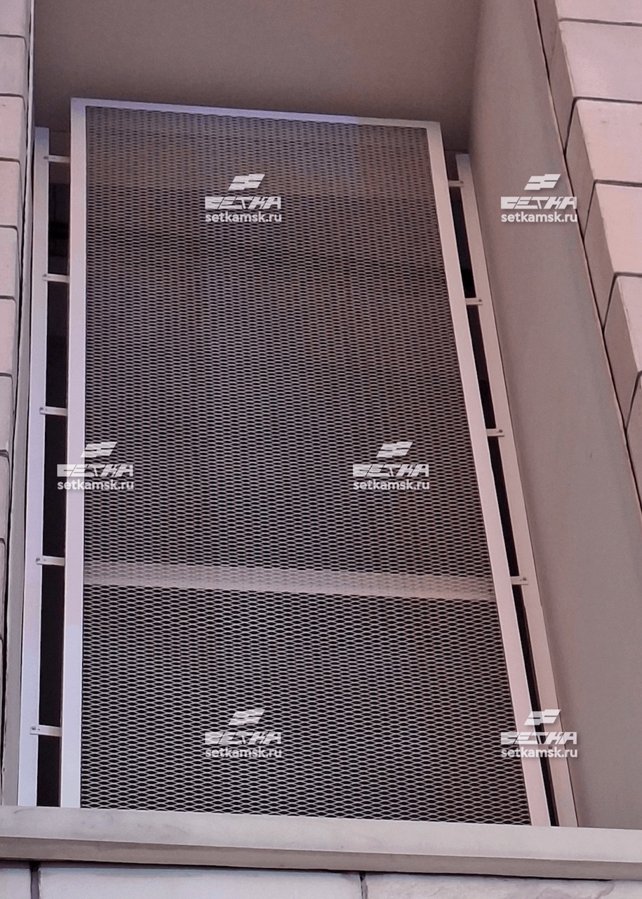 Учитывая, что конструкция временная и монтировалась на существующие проемы без усиления, вес имел значение. Алюминий в 2–3 раза легче стали, поэтому выбор пал на него. Алюминий также обладает коррозионной стойкостью, отсутствует необходимость в окраске, это долговечный и экологичный материал. Четкая геометрия и металлический блеск алюминия отлично подошел для решения данной задачи. Ячейка 42х22 обеспечила необходимую вентиляцию.
