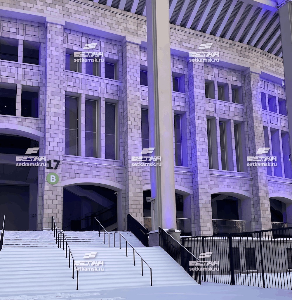Чтобы поверхность арены стала более плоской, было принято решение установить временные фасадные панели, которые бы закрывали эти проёмы, но при этом были бы не сильно заметны. Днем панели выглядят частью технологичного фасада, не вступая в диссонанс с основным зданием.