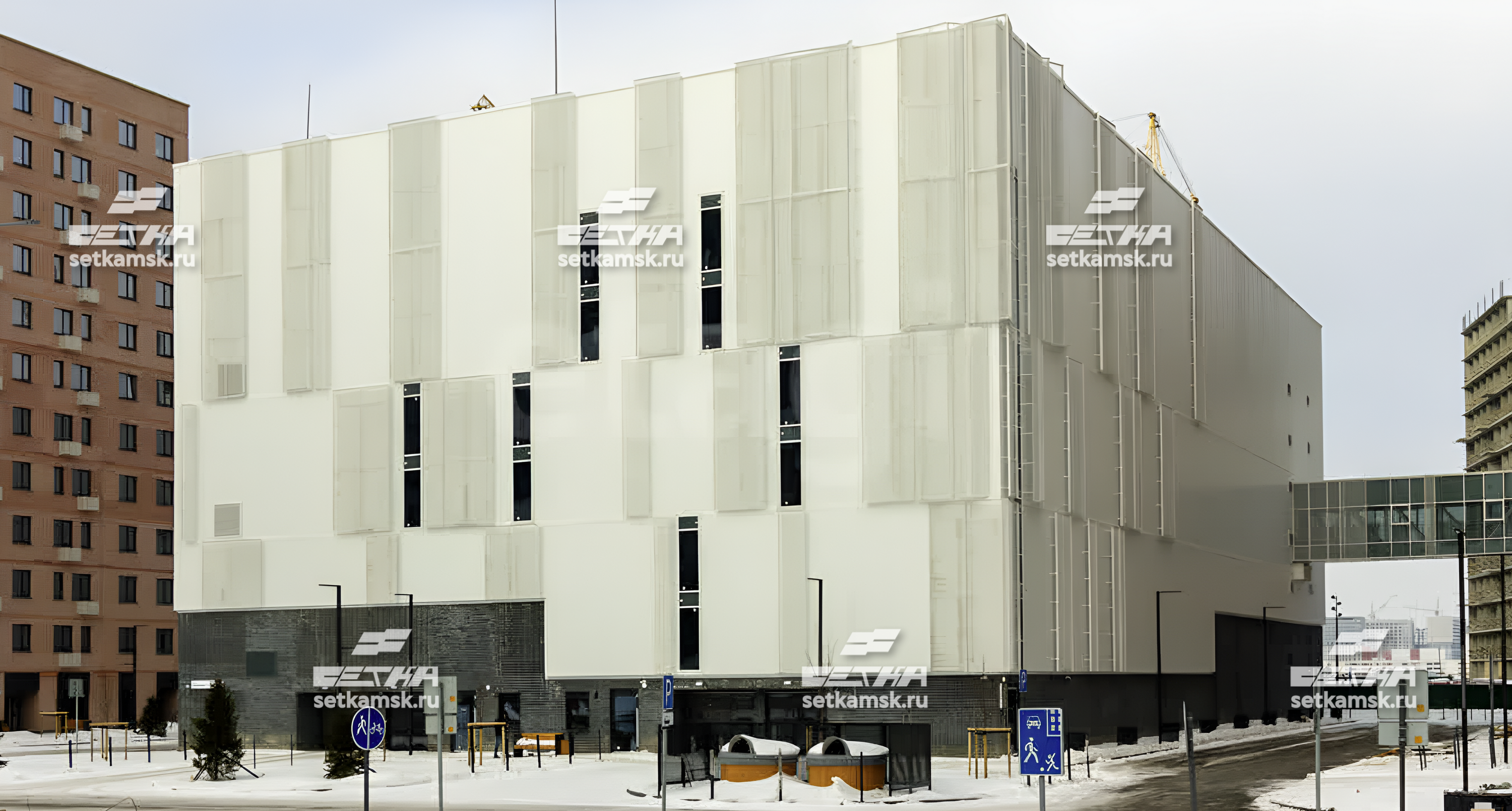Фасадные панели в этом случае не играют самостоятельной роли, а создают дополнительную фактуру, чтобы здание не выглядело слишком простым. Сетка разбавляет монотонность большого объема парковки, добавляя визуальную глубину и текстуру. В сочетании с ночной подсветкой такие панели позволяют зданию гармонично вписаться в концепцию современного жилого квартала, не выглядя утилитарно и просто.